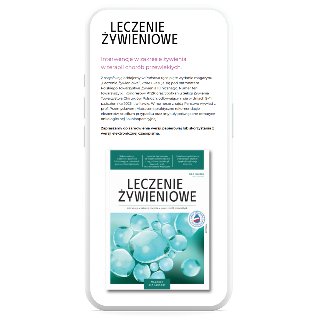 Z satysfakcją oddajemy w Państwa ręce piąte wydanie magazynu „Leczenie Żywieniowe”, które ukazuje się pod patronatem Polskiego Towarzystwa Żywienia Klinicznego. Numer ten towarzyszy XII Kongresowi PTŻK oraz Spotkaniu Sekcji Żywienia Towarzystwa Chirurgów Polskich, odbywającym się w dniach 9–11 października 2025 r. w Iławie. W numerze znajdą Państwo wywiad z prof. Przemysławem Matrasem, praktyczne rekomendacje ekspertów, studium przypadku oraz artykuły poświęcone tematyce onkologicznej i okołooperacyjnej.